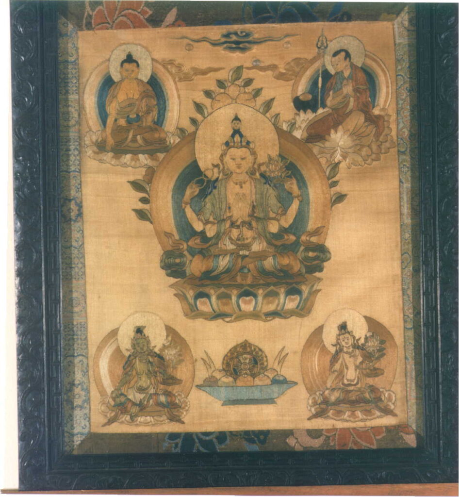 Thangka dedicado a una de las advocaciones del bodhisattva Avalokitesvara, conocida como Shadakshari Avalokitesvara. Con este nombre, “el de la Sexta Sílaba” se alude a la personificación del sentido de liberación que implica el mantra Om Mani Padem Hum. Para ello se le representada sentado sobre una flor de loto, con cuatro brazos, dos de los cuales sujetan dos de sus atributos. Con uno de sus brazos derechos eleva un rosario, mientras que con uno de los del costado izquierdo, la flor de loto. Con sus dos brazos centrales, recogidos sobre su pecho, sostiene entre sus manos la joya sagrada. Su rostro se enmarca en una tiara de cinco puntas, y su cabello está rematado con una pequeña cabeza, todo ello recogido en la luz de la aureola circular, completada con otra de mayor tamaño que enmarca toda la figura.Avalokitesvara, en tibetano recibe el nombre de Chenrezig, “el señor que vigila”, siendo una de las máximas divinidades protectoras del país. El introductor del budismo en Tíbet, Sontsen Gampo, así como el Dalai Lama son considerados encarnaciones de Avalokitesvara.La figura central está rodeada de cuatro imágenes religiosas sedentes, cada una de ellas identificada mediante sus atributos y gestos. Así en el ángulo derecho superior se representa la serena figura de Buda, en el ángulo izquierdo a Sontsen Gampo, cuya mirada se dirige hacia Avalokitesvara. En el plano inferior, dos divinidades femeninas de gran devoción en Tibet, Tara Verde y Tara Blanca, flanqueando una fuente con símbolos alusivos al budismo, destacando el dharma.La presencia de estas divinidades femeninas está directamente relacionada con Songtsen Gampo, a través de sus esposas, y a su vez con Avalokitesvara. Tara Verde, se sienta en la postura de lalitasana, sujetando con su mano izquierda la flor de loto, mientras que Tara Blanca, se sienta en posición de loto o diamante, sujetando así mismo con su mano izquierda una flor de loto. / Extraído de: Isabel CERVERA FERNÁNDEZ: Fundación Rodríguez-Acosta. Colección de Arte Asiático. Granada, 2002.Bibliografía: RHIE, M.; THURMANN, R.: Wisdom and Compassion. The Sacred Art of Tibet. Nueva York, 1992, p. 145.