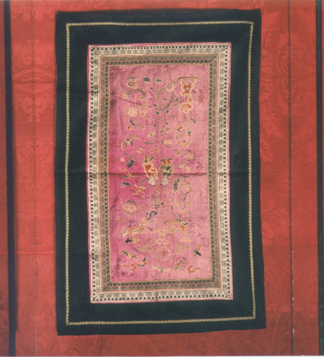 Satén de seda bordado, montado sobre algodón y seda adamascada.