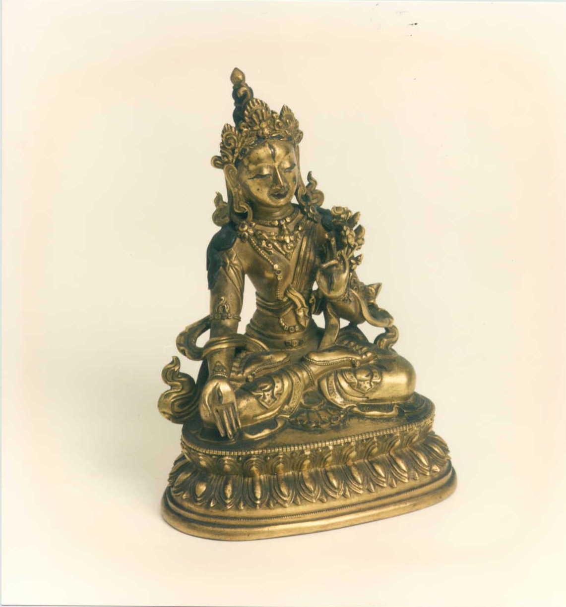 Se trata de una imagen de la diosa Tara en su aspecto de Tara Blanca o Sitatara, la Tara china. Presenta los siete ojos y está en padmasana, postura de meditación, según su iconografía habitual. Tiene la cara de rasgos achinados con el tercer ojo vertical y restos de policromía. Lleva una diadema de tres puntas, de las cuales en la central aparece la triratna, y detrás el cabello, pintado de negro, recogido en una usnisha muy alta y con dos mechones laterales que caen sobre los hombros. Vestida y adornada al modo usual de los bodhisattvas, con un chal sobre los hombros, que forma al final las características volutas de influencia china, y una banda que cruza el pecho y que también es visible en la parte posterior.Está sentada sobre una base formada por dos filas de pétalos de loto muy estrechos, con un contario en la parte superior. La base queda lisa en su parte central, mientras la parte posterior está modelada cuidadosamente. Observaciones: En la base un visva?vajra, en cuyo centro se encuentra el taiqi (yin/yang). R.C.M. / Extraído de: Isabel CERVERA FERNÁNDEZ: Fundación Rodríguez-Acosta. Colección de Arte Asiático. Granada, 2002.Bibliografía: COMAS, R.: El arte del Himalaya en las colecciones españolas: los bronces. Madrid, 1993, p. 390.