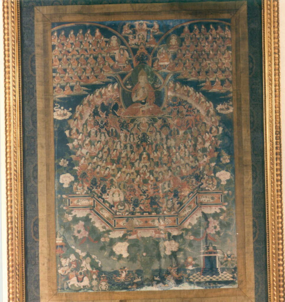 Realizando la lectura visual de la obra desde la zona inferior, observamos cómo del centro inferior y en dirección ascendente surge desde las profundidades del océano un árbol de espesa fronda. Siguiendo el eje del tronco, la figura de Tsongkapa aparece retratado con el gorro de la orden Gelupa e indumentaria monástica. Tsong Kapa sentado en la postura de loto, sostiene en su mano izquierda el cuenco de limosnas, mientras que con la mano derecha realiza la mudra “vitarka?mudra”. Entre sus manos sujeta los tallos de los lotos que flanquean la figura, que a su vez son soporte de dos atributos característicos de la iconografía de Tsongkapa, el puñal y el libro. En su pecho está dibujada una imagen de Buda, señalando su linaje espiritual. Los personajes que rodean la figura de Tsongkapa se agrupan en tres zonas. Siguiendo el sentido geométrico general de la composición, los dos grupos de los ángulos superiores agrupan 45 figuras cada uno de ellos, flanqueando a seis personajes principales, que remiten al linaje superior del fundador de la orden Gelupa. En el círculo central la imagen de Tsongkapa está rodeada en sentido circular por sus más fieles seguidores y discípulos ?círculo exterior?, al mismo tiempo que en su entorno más próximo está protegido por los guardianes o Dharmapalas del paraíso budista. Estos últimos se reconocen por sus rostros negros, de aspecto animal y terrorífico, en actitud desafiante y protectora. Los dharmalas de su lado izquierdo abrazan a sus parejas o yakthis, en una postura cargada de simbología, conocida con el nombre de yab?yum. Continuando el eje central en sentido descendente se suceden cinco personajes principales: Tsongkapa, Hejvajara, Buda, Maitreya o Vajradara, guardianes y por último las divinidades menores. Desde el punto de vista del estilo, este Thangka debe encuadrarse en el gusto chino?tibetano de los siglos XVIII?XIX. El orden de la composición, los elementos arquitectónicos y muy especialmente la introducción de elementos florales, nos recuerdan a la pintura decorativa y cortesana realizada en China en esta misma época. / Extraído de: Isabel CERVERA FERNÁNDEZ: Fundación Rodríguez-Acosta. Colección de Arte Asiático. Granada, 2002.Bibliografía: RHIE, M.; THURMANN, R.: Wisdom and Compassion. The Sacred Art of Tibet. Nueva York, 1992, p. 372