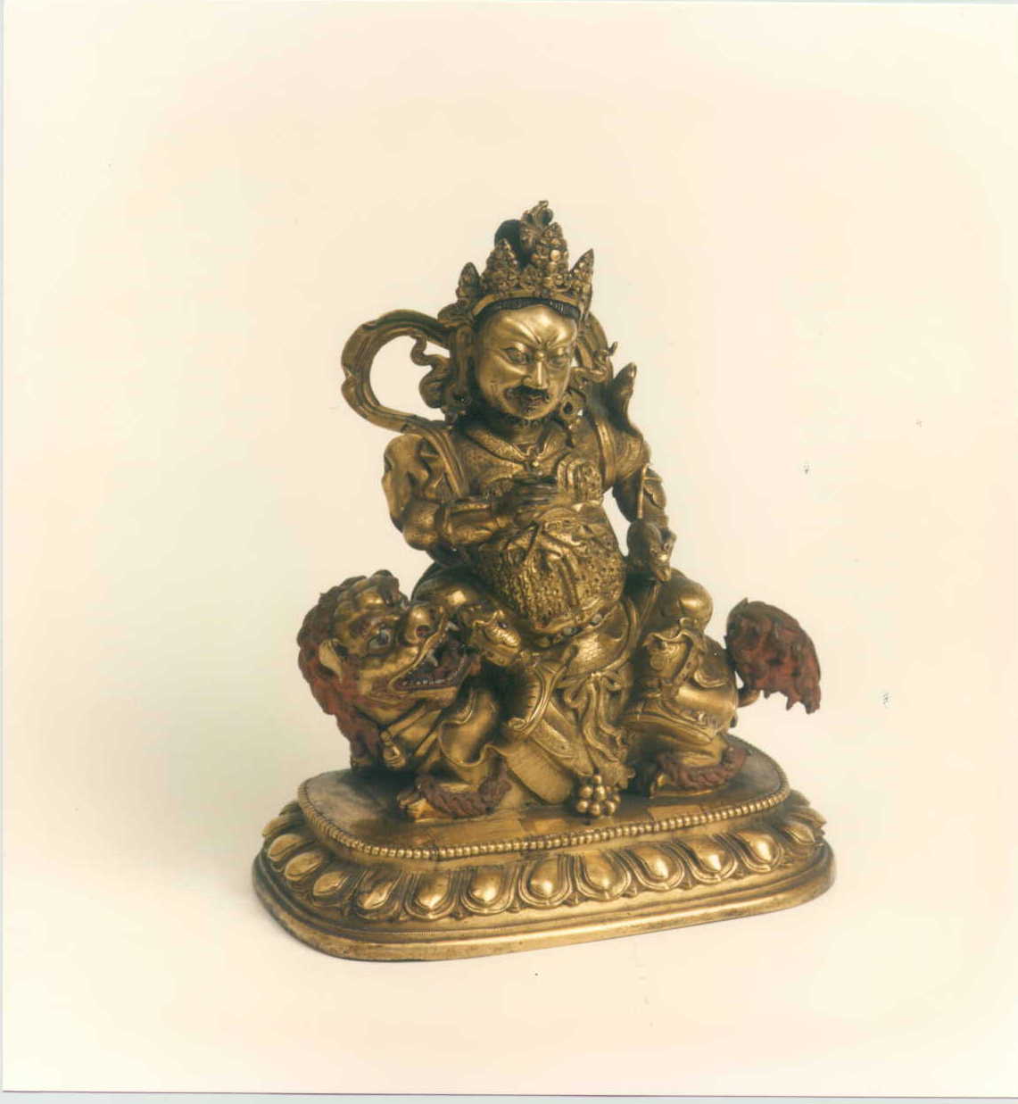 Se trata de la representación de uno de los Lokapalas o Dikapalas (Guardianes de los puntos cardinales); concretamente el del norte, Vaisvarana, que se asimila a la divinidad hindú Kubera, y por lo tanto al dios de la riqueza Jambhala. Aparece bajo la forma Mahapita Vaisravana “El gran Vaisravana amarillo”.Los Lokapalas aparecen pintados en las entradas de los templos y constituyen una de las imágenes más populares de la iconografía “lamaísta”. De vientre prominente y cuerpo fuerte, su origen está en los yakshas hindúes, y su aspecto grotesco los acerca a las divinidades terroríficas. Se les representa como guerreros con cota de malla del tipo chino?mongol, botas altas, y una máscara de animal que protege el vientre, y sentados como príncipes en maharajalilasana. Vaisravana tiene como atributos característicos el estandarte en la mano derecha (que en esta imagen no aparece) y en la mano izquierda la mangosta, vencedora de las serpientes y mítica guardiana de los tesoros, de cuya boca salen joyas, por lo cual se asocia con la riqueza (en la doctrina budista el deseo de repartirla a los pobres).Se le considera protector de la salud, por lo que es muy popular entre los tibetanos. Su expresión ceñuda lo aleja de la serenidad de las divinidades pacíficas. Lleva un chal que circunda la figura a modo de aureola, y bajo su vientre aparece una cabeza del animal con cuya piel se envuelve. El movimiento de la figura se ve acrecentado por detalles tales como las mangas que se disparan hacia arriba, lo que puede ser considerado como una característica china; lo mismo sucede con las cintas que sujetan la corona.Se sienta sobre un león adornado con telas, y éste a su vez reposa sobre una base con una sola fila de pétalos de loto, sobre el cual aparecen en el centro joyas agrupadas piramidalmente. La parte posterior está trabajada minuciosamente, salvo la parte central de la base que aparece lisa, lo cual es característico de las imágenes de influencia china desde el s. XVII. Otros rasgos de influencia china son el chal, el tipo de vestimenta, el calzado y el león. El uso de pintura en el cabello y en la parte interior de la corona indica su adoración en Tibet. El tono dorado indica una fecha tardía. R.C.M. / Extraído de: Isabel CERVERA FERNÁNDEZ: Fundación Rodríguez-Acosta. Colección de Arte Asiático. Granada, 2002.Bibliografía: COMAS, R.: El arte del Himalaya en las colecciones españolas: los bronces. Madrid, 1993, p. 398