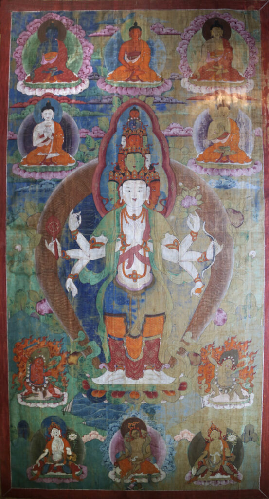 Thangka dedicado a Avalokitesvara, el bodhisattva de la compasión, que aparece de pie en su visión cósmica sobre una flor de loto, rodeado por diferentes figuras de budas y divinidades protectoras.Avalokitesvara aparece aquí representado en toda su compasión reflejada en su multiplicidad de brazos como alusión al deseo de ayudar y de cabezas que indica que todo lo conoce y todo lo ve. Relacionado con la multiplicidad de rostros existe una tradición que explica esta representación a partir de la visión que tuvo Avalokitesvara del mundo y sus tristezas. Tras ello se le rompió la cabeza y Amitabha formó a partir de sus pedazos, nuevas cabezas. Con ellas quiere simbolizar que conoce los diez estadios del bodhisattva, representando con cada una de ellas una actitud y un estadio concreto. Tres de ellas simbolizando la capacidad de amar, tres la de pacificar y cuatro muestran la ferocidad. Coronando todas ellas una cabeza de menor tamaño alude a Amitabha, mostrando de este modo que Avalokitesvara posee el carácter de Buda, y que en él se personifica la compasión de los budas. Esta advocación de Avalokitesvara, se conoce con el nombre de Ekâdaçamuka “aquel que tiene once rostros”. El cuerpo está pintado de blanco, y cubierto por un dhoti en su mitad inferior y un chal que cubre los hombros. Sin embargo los once rostros del bodhisattva presenta una combinación triple por pisos de verde, blanco, rojo, alternando la posición de los colores en cada uno de los niveles. Todos ellos aparecen tocados con una diadema principesca, atuendo que se repite en los brazaletes de sus muñecas y en los collares que le cubren el pecho.Con sus ocho brazos realiza diferentes gestos y sostiene variados atributos. Así, con dos de sus brazos realiza el gesto añali-mudra, o gesto de ofrenda, con las manos junto a su pecho sujeta la perla de la sabiduría y mirándose las palmas. En su lado derecho, sostiene en el antebrazo central, la rueda de la doctrina , mientras que en el superior un rosario para recitar el mantra om mani padme hum. El cuarto muestra su mano en dirección hacia la tierra realiza diferentes gestos simbólicos. En su brazo central izquierdo sostiene un arco símbolo de meditación y sabiduría, en el superior una flor de loto y en el inferior un pequeño búcaro que contiene el elixir de la inmortalidad.En la parte superior del Thangka se sitúan seis figuras sedentes sobre un trono en forma de flor de loto, aureolas, y realizando diferentes gestos con las manos. Todos ellos son representaciones de Buda en diferentes actitudes, colores corporales y advocaciones. En la línea superior y de izquierda a derecha, se aprecia una figura pintada de azul oscuro, realizando con las manos la bhûmisparça-mudra, mediante la que pone a la tierra por testigo de su iluminación. La figura central, de color naranja, se representa en meditación a través del gesto dhyâna – mudra de sus manos apoyadas en el regazo con las palmas hacia arriba y una sobre otra. A su izquierda un tercer Buda repite el gesto de bhûmisparça-mudra. Su cuerpo presenta un color ocre y al igual que el del extremo izquierdo la aureola exterior se ha remarcado con una cenefa de nubes rosas y blancas.Bajo ellos aparecen otras dos figuras de Buda, siguiendo el mismo esquema pero variando los gestos de las manos y el color de sus cuerpos. A la izquierda, un Buda de color blanco, gira sus manos haciendo girar la rueda de la ley en dharmaçakra-mudrâ o vitarka (comprobar), mientras que a su derecha, y pintado el cuerpo de color ocre, con la mano derecha y mostrando la palma nos dice “no temáis” (abhaya-mudrâ).A los pies de Avalokitesvara, y flanqueando su figura, dos guardianes protectores o dharmapalas de pie sobre una flor de loto y rodeados de fuego. En el plano inferior tres imágenes sedentes de bodhisattvas advocaciones del propio Avalokitesvara. Asía las dos figuras de los extremos le representan como Padmapani, el “señor de la flor de loto”, sosteniendo en su mano izquierda la flor de loto. / Extraído de: Isabel CERVERA FERNÁNDEZ: Fundación Rodríguez-Acosta. Colección de Arte Asiático. Granada, 2002.Bibliografía: RHIE, M.; THURMANN, R.: Wisdom and Compassion. The Sacred Art of Tibet. Nueva York, 1992, p. 143.