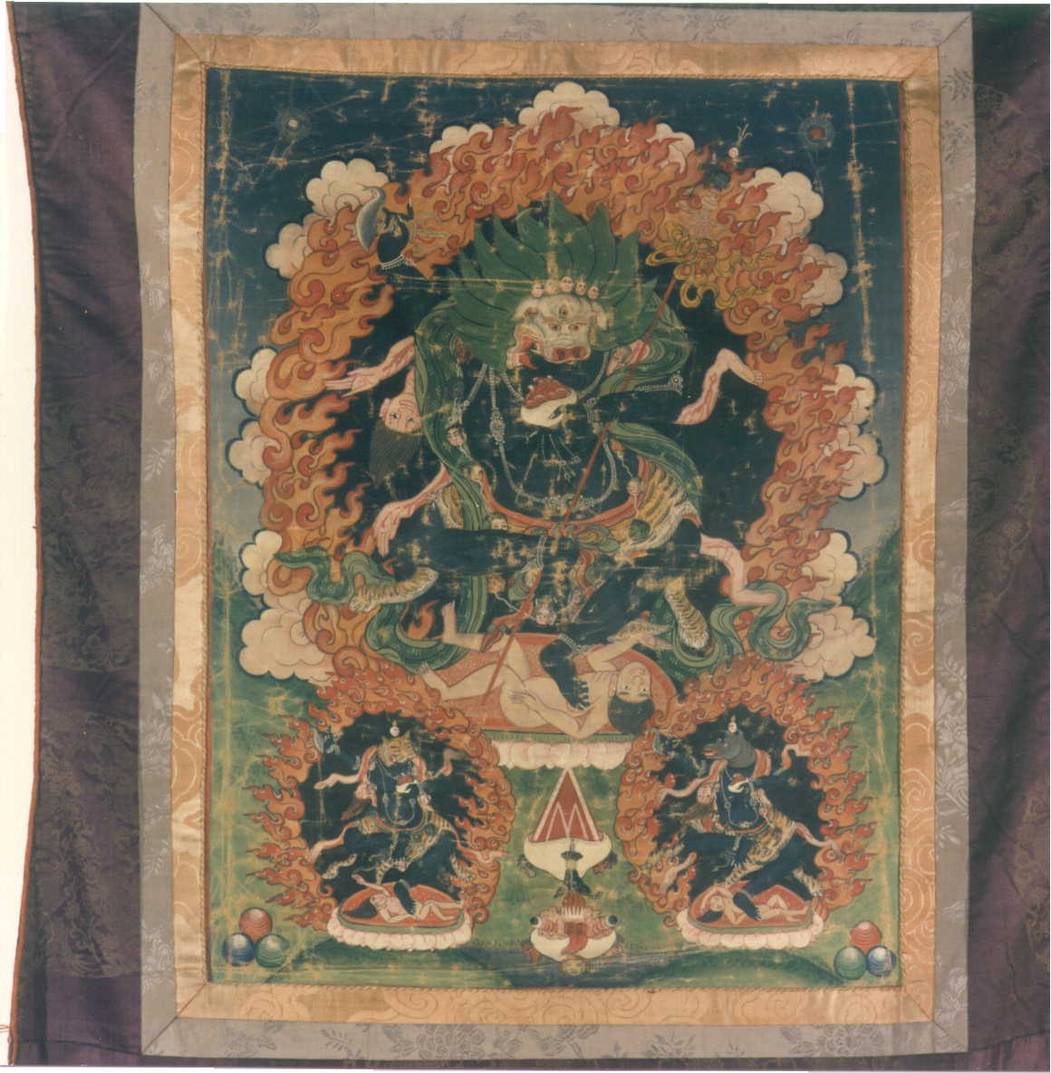 Pintura dedicada a la divinidad protectora de aspecto terrorífico Yama Dharmaraja, el Rey de la Ley, que ocupa el lugar más destacado de la composición acompañado de dos guardianes, representados a sus pies en menor tamaño. Las tres figuras se enmarcan en un halo de fuego, como contraposición al halo de luz que envuelve las imágenes de maestros, budas, bodhisattvas y lamas.Yama Dharmaraja, es una divinidad de origen indio, que se entreteje en la mitología budista por asociación con Mansjuri. Yama Dharmaraja, protector de la ley en cuanto doctrina, tiene una gran aceptación en las representaciones del budismo tibetano y de un modo especial en aquellas relacionadas con la secta Gelukhpa. Su fundador, Tsonghapa, se identifica con Mansjuri y éste con el dios protector.Cada una de las imágenes de los dioses protectores pueden manifestarse en su realidad interna, externa o en su forma última. En este caso se manifiesta en su realidad externa, adoptando por ello su cabeza, la de un búfalo. De este modo se hace eco de las amenazas externas, y protege las vidas de fieles y monasterios.El cuerpo de Yama Dharmaraja aparece pintado de un color oscuro, agitándose en un movimiento frenético con sus brazos y piernas. La pierna la derecha se pliega en una acción rítmica que se ve equilibrada, con el leve apoyo que ejerce con la pierna derecha sobre el torso desnudo de un personaje que yace bajo sus pies. En sus brazos superiores sostiene en cada una de ellas un atributo. Así con la derecha sujeta un cuchillo con el mango en forma de vajra, denominado kartrikâ,, mientras que con la izquierda, el tridente que le caracteriza está rematado por unas calaveras ensartadas en su punta, junto con un vajra y un lazo, conocido como khatvânga o cetro mágico.Su frente está adornada con una diadema formada por calaveras, que se repiten en un largo collar que recorre todo su cuerpo. Se cubre parcialmente con una piel de tigre y de su espalda asoma los restos de un ser humano cubierto de sangre en alusión directa con la muerte. Toda su iconografía resalta su carácter violento, protector, que encontrará su descanso cuando destruya la ignorancia a la que se alude con el cuerpo desnudo sobre el que apoya la fuerza de su baile.A sus pies otras dos imágenes terroríficas de divinidades protectoras o yamas, que adquieren , la de la derecha rostro de tigre y la de la izquierda de rinoceronte, repitiendo en ambos casos los elementos iconográficos relacionados con la muerte y destrucción. / Extraído de: Isabel CERVERA FERNÁNDEZ: Fundación Rodríguez-Acosta. Colección de Arte Asiático. Granada, 2002.Bibliografía: RHIE, M.; THURMANN, R.: Wisdom and Compassion. The Sacred Art of Tibet. Nueva York, 1992, pp: 108?109.